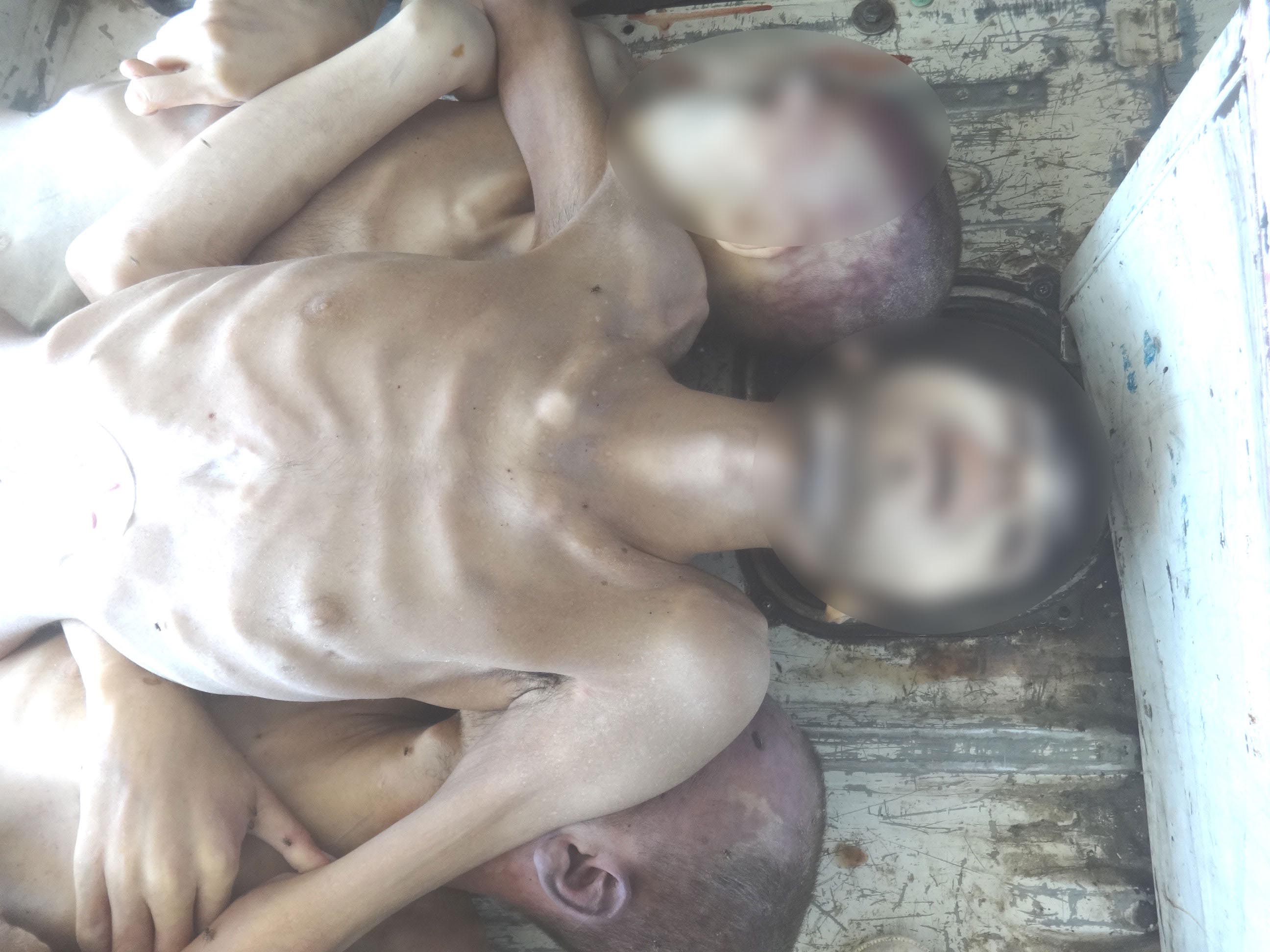 تُظهر صور أخرى جثثا متراكمة كالحطب؛ أذرعهم وأرجلهم هزيلة، وأفواههم مفتوحة، وأعينهم نصف مغمضة، وعليها آثار تعذيب واضحة… جاهزة للتخلص منها.