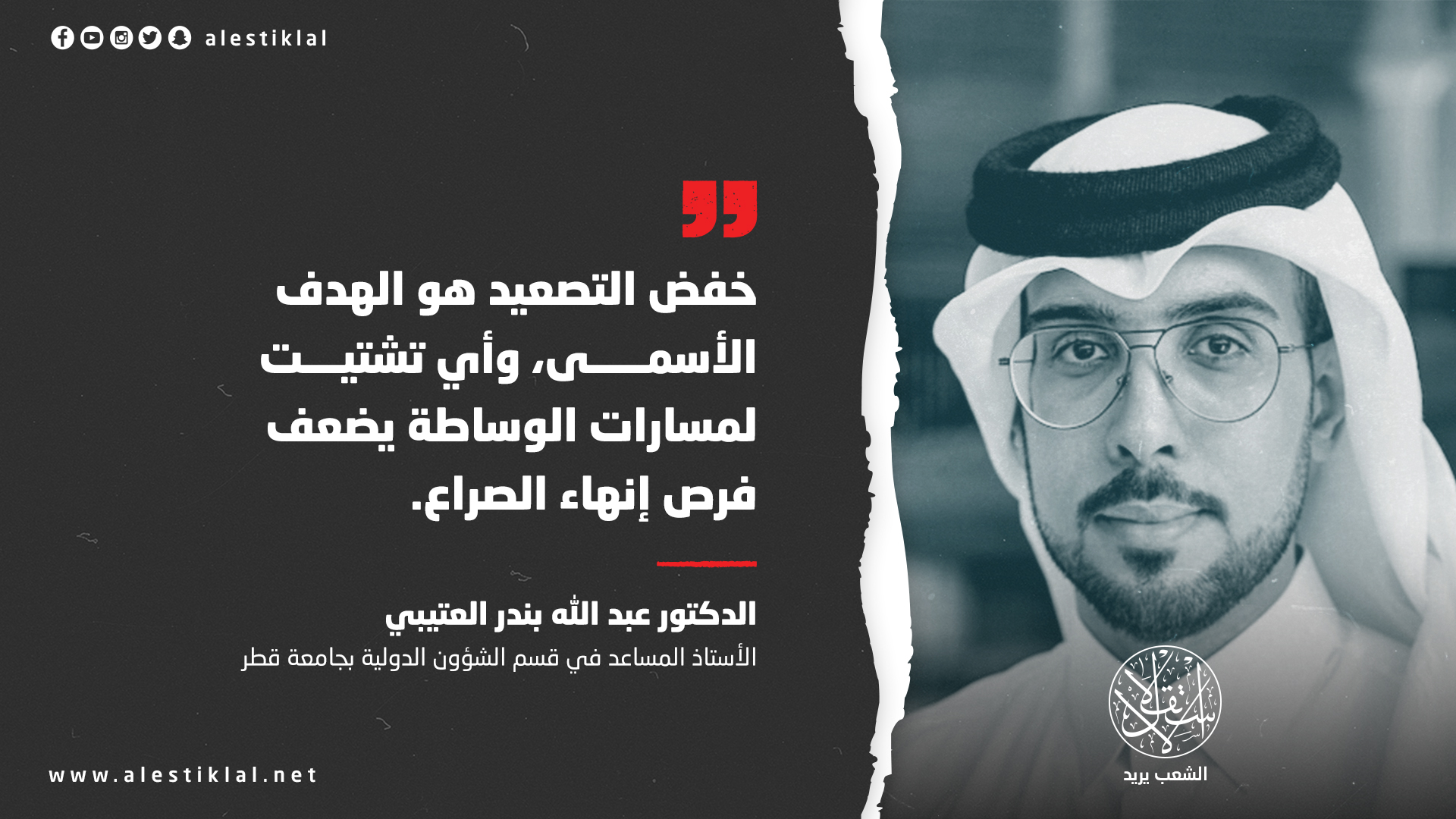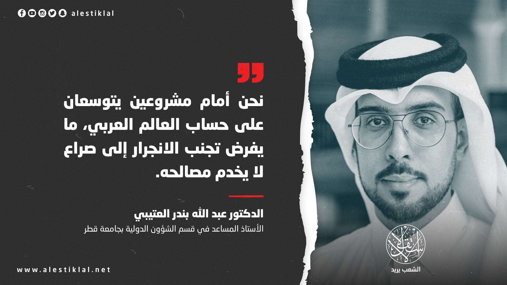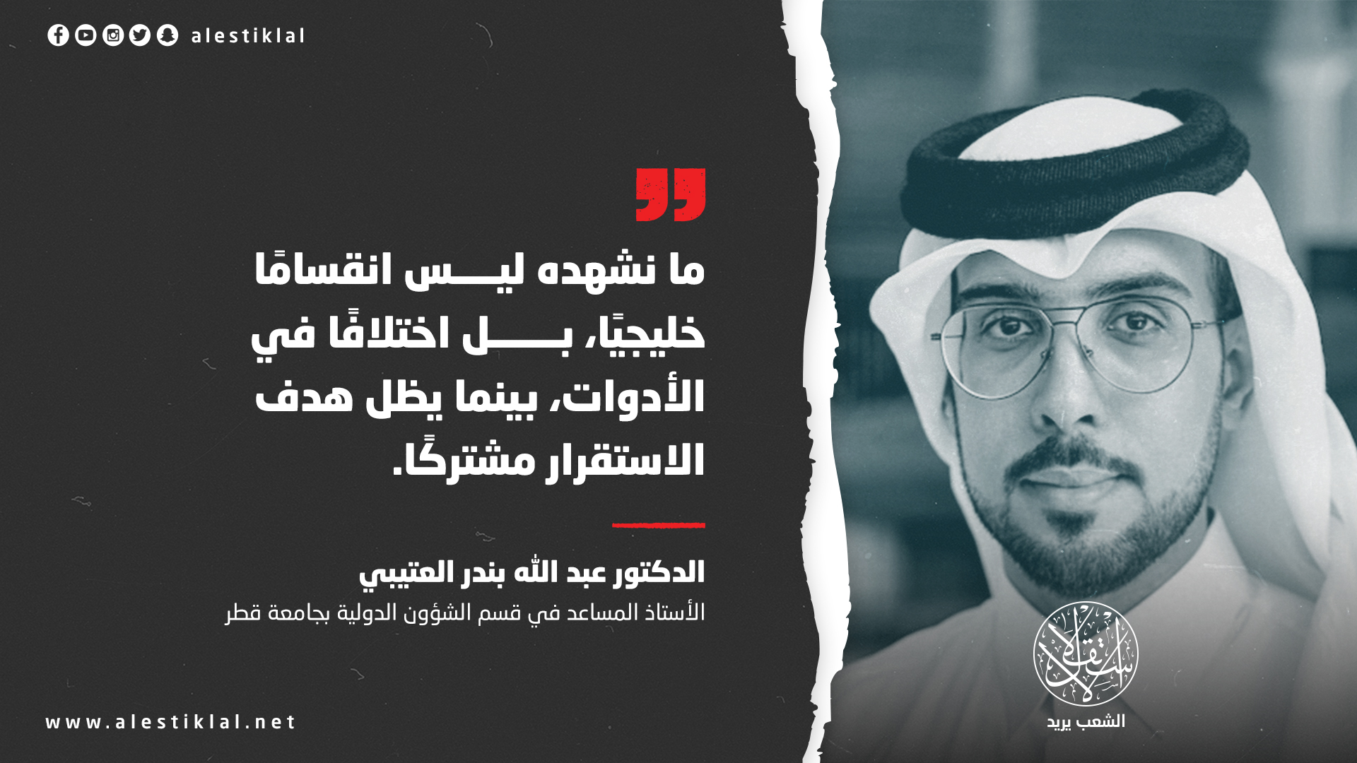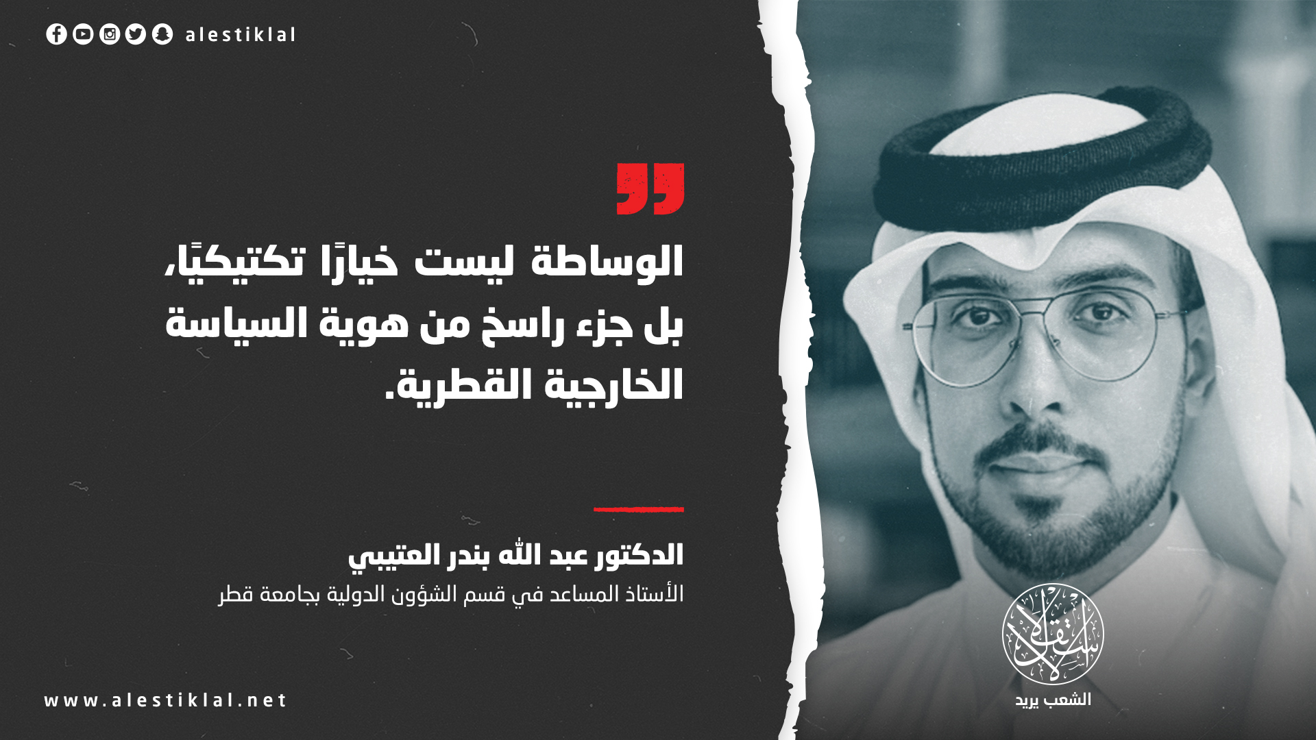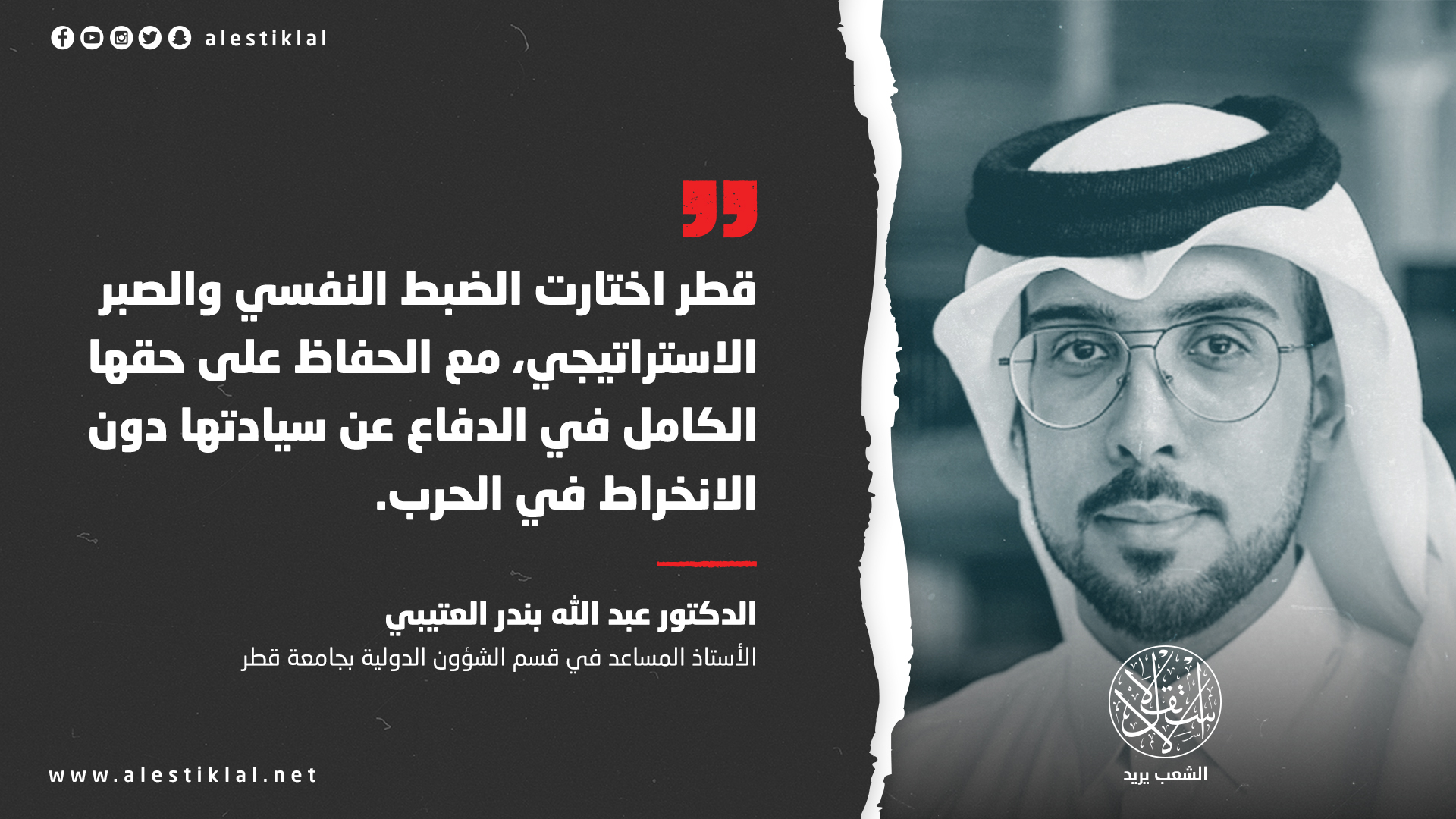 في هذا السياق، يقدّم الأستاذ المساعد في قسم الشؤون الدولية بجامعة قطر، الدكتور عبد الله بندر العتيبي، قراءة معمقة للمقاربة القطرية، بوصفها نموذجًا لسياسة تقوم على التوازن بين الحزم وضبط النفس، وعلى إدارة الأزمات عبر أدوات دبلوماسية طويلة النفس، لا تنحصر في ردود الفعل الآنية.