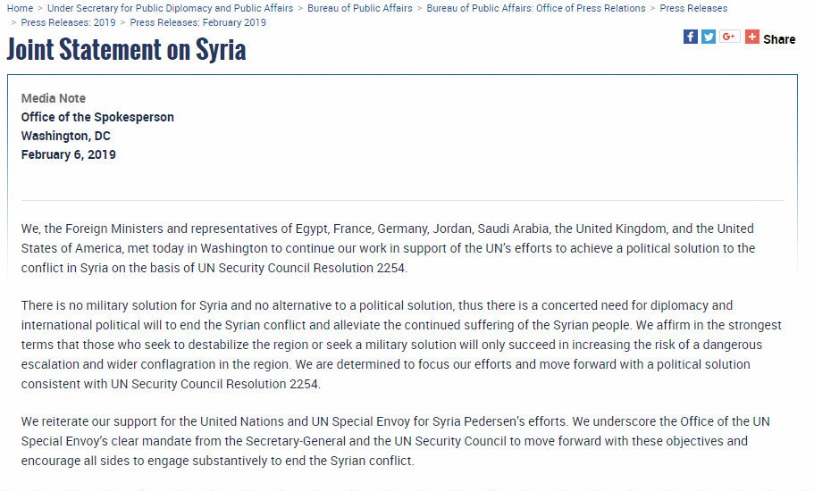 وفي 6 فبراير/ شباط 2019، اجتمع وزراء خارجية الولايات المتحدة، ومصر، وفرنسا، وألمانيا، والأردن، والسعودية، وبريطانيا، بالتزامن مع المؤتمر الذي جمع 79 دولة عضوة بالتحالف المضاد لتنظيم الدولة في واشنطن، ونشروا بيانا مشتركا ذكروا فيه، أن "تركيا تعتبر قوة تهدد استقرار المنطقة".
