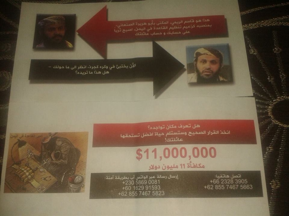 وورد في أحد المنشورات نصا باللغة العربية يشبه الإعلانات التجارية مكتوبا عليه "هذا هو قاسم الريمي المكنى بأبوهريرة الصنعاني... بمنصبه كزعيم لتنظيم القاعدة في اليمن، أصبح ثريا على حسابك وحساب عائلتك".