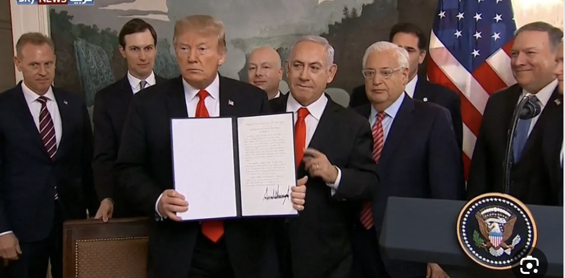 في 15 مارس/آذار 2019 وقع ترامب في أثناء ولايته الرئاسية الأولى إعلانا تعترف الولايات المتحدة بموجبه بسيادة إسرائيل "الكاملة" على مرتفعات الجولان، التي احتلتها عام 1967 وضمتها إليها في 1981، في خطوة لا يعترف بها المجتمع الدولي.