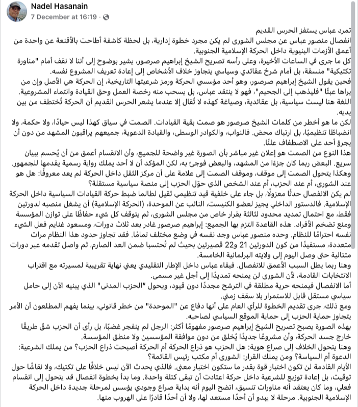 "عباس" قال يوم 6 ديسمبر/كانون الأول 2025: "أنا لست إخوانيا، وهناك تغيير جوهري في الحزب، سننفصل عن الحركة الإسلامية وستكون "راعم" بنية سياسية مستقلة".