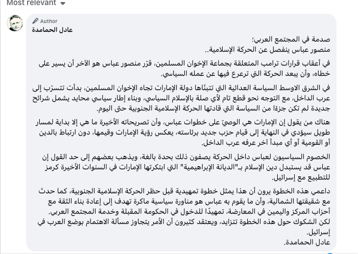 كتب في صفحته على "فيسبوك" يقول: "الحركة الإسلامية هي الأصل الأصيل والركن الشديد. أقامت حزبها السياسي ليكون سياجا أمنيا لها! فإن رأى فيها (عباس) عبئا، فليذهب الى الجحيم!".