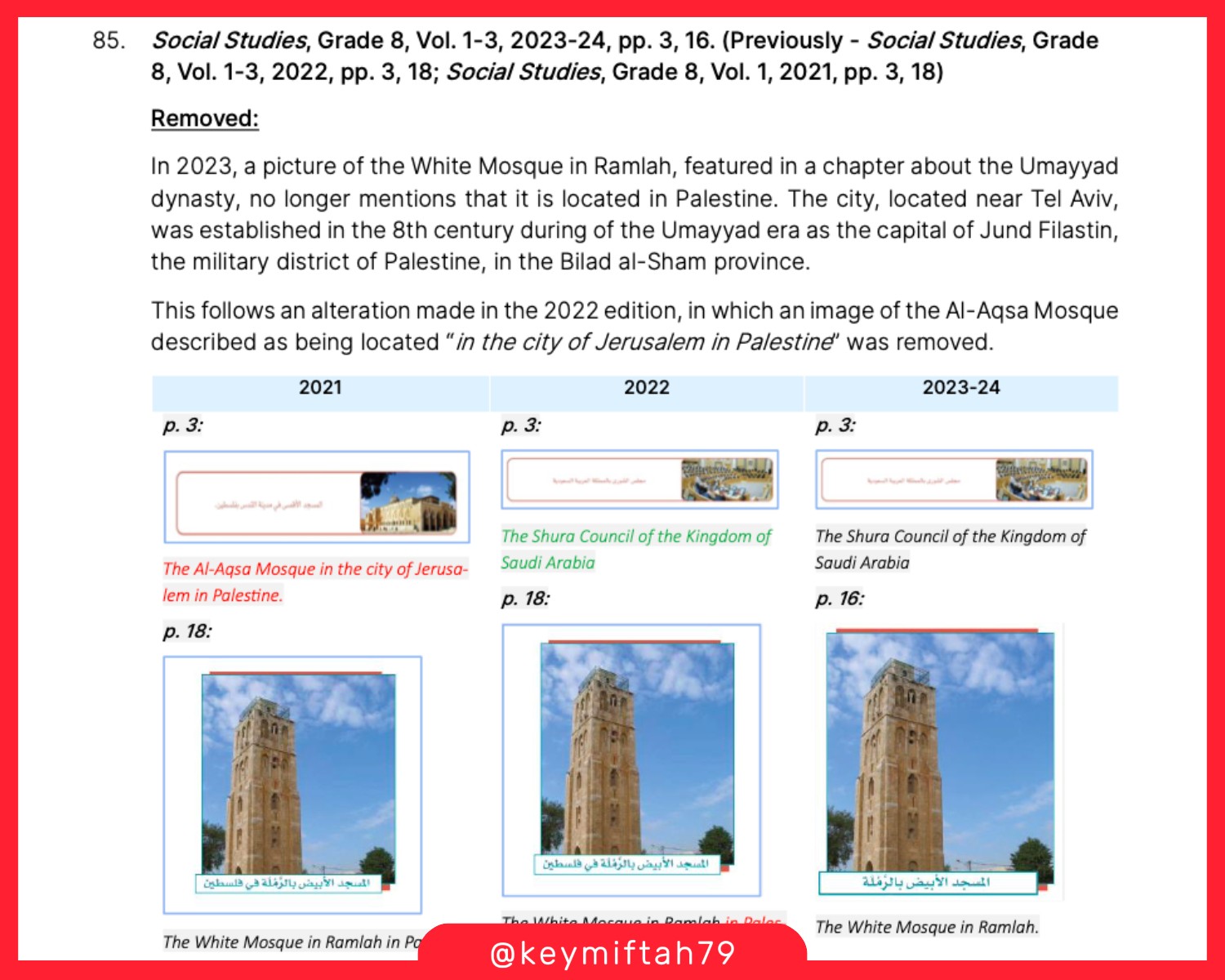 كما جرى تغيير التعليق على صورة أخرى للمسجد الأبيض بالرملة، بإزالة "فلسطين" كمكان وجود الجامع، في نسخة 2023.