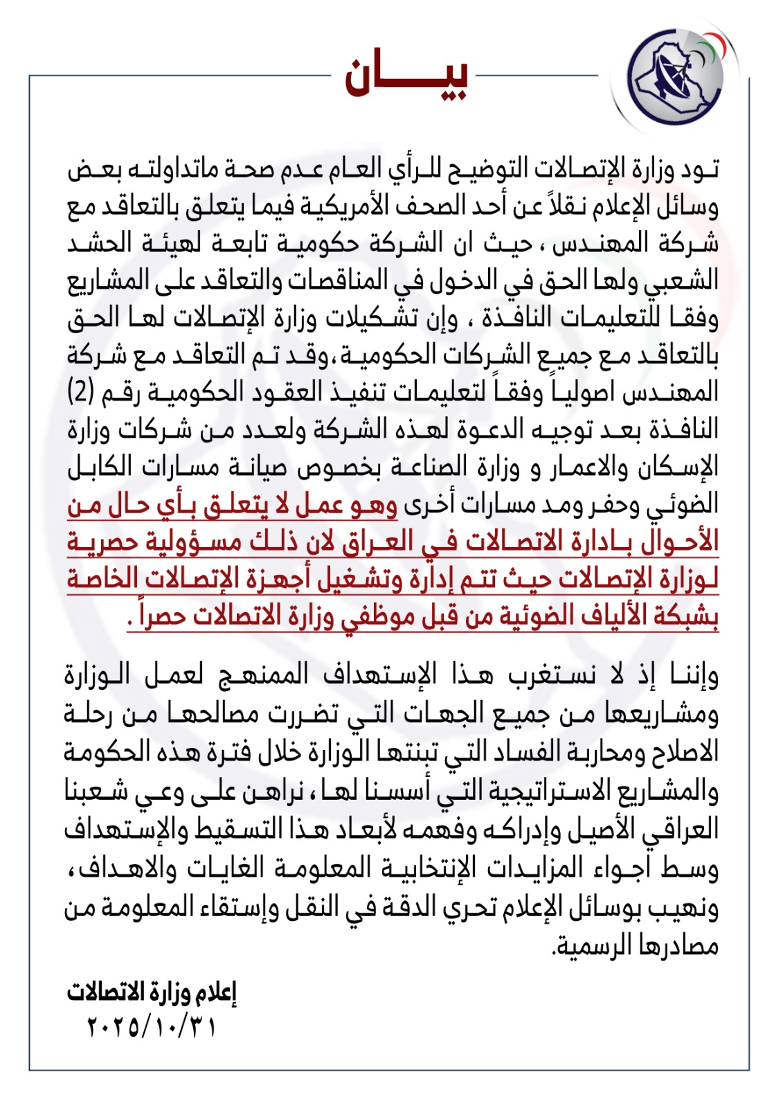وأوضحت الوزارة أن ما قامت به الشركة "لا يتعلق بأي حال من الأحوال بإدارة الاتصالات في العراق، إذ إن إدارة وتشغيل أجهزة الاتصالات الخاصة بشبكة الألياف الضوئية تقع حصريًا على عاتق موظفي الوزارة".
