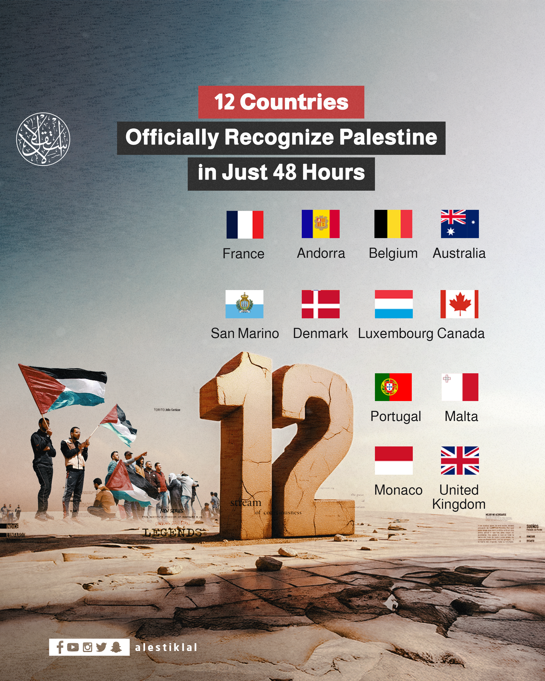 After 80 years of injustice, 12 countries recognize Palestine in just 48 hours, including France and Britain.