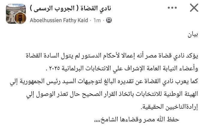 The Judges Club affirmed that judges and members of the public prosecution did not oversee the 2025 parliamentary vote in accordance with constitutional provisions, an implicit reference to the fact that the process had instead been supervised by government-appointed jurists from the State Lawsuits Authority and the Administrative Prosecution Authority.