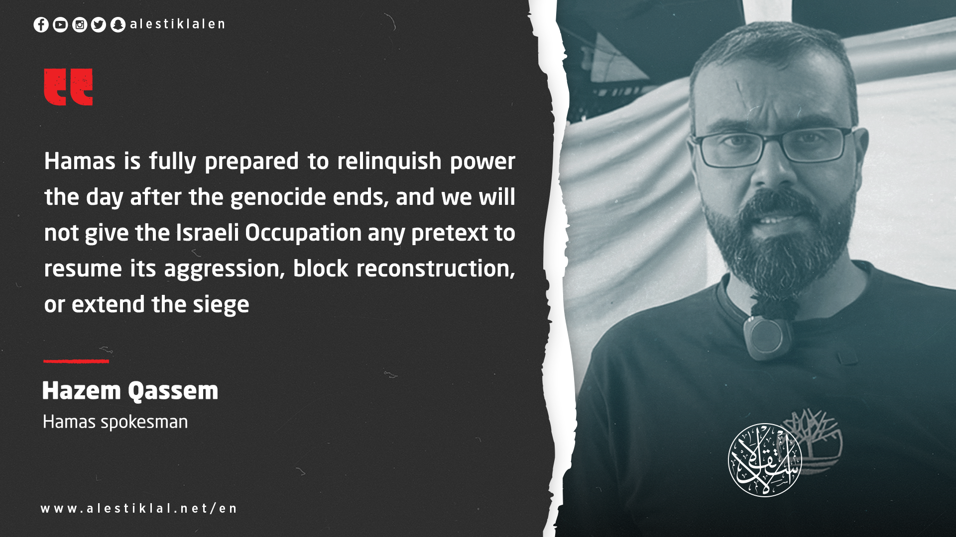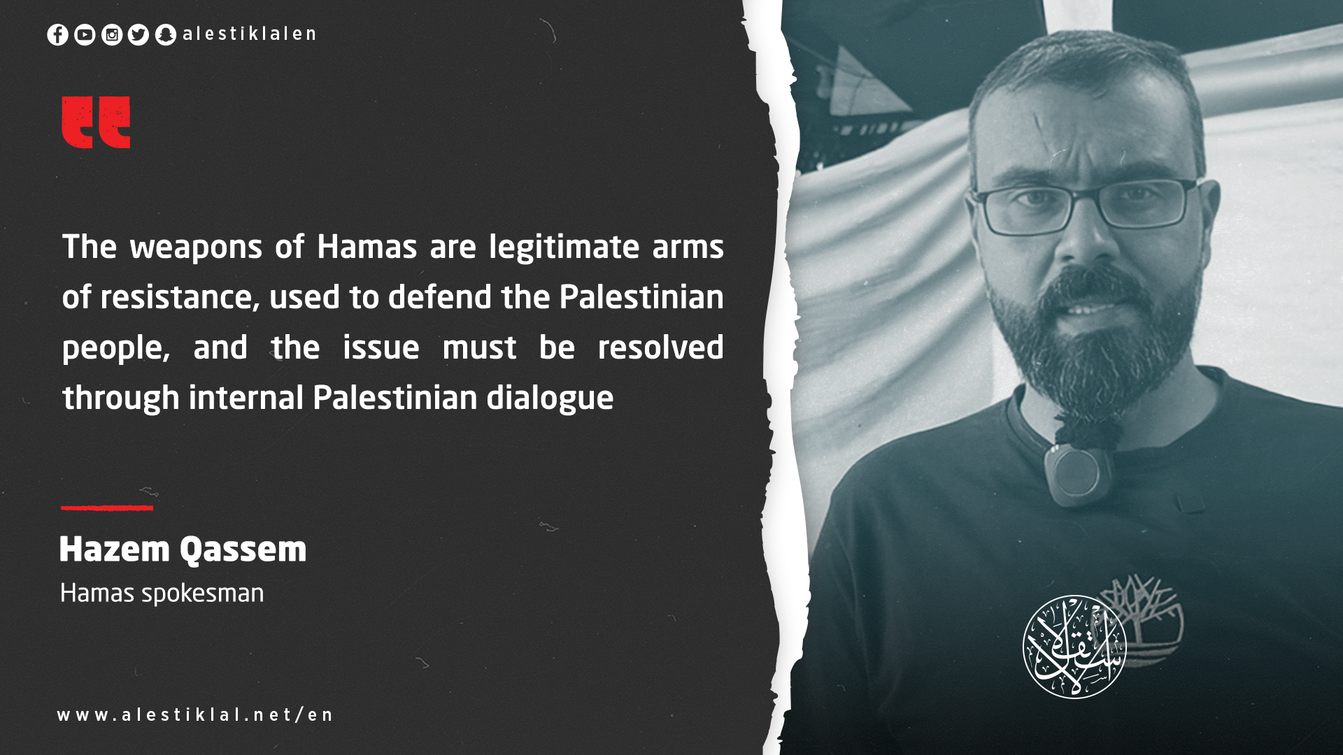 In an interview with Al-Estiklal, Hamas spokesman Hazem Qassem said the movement’s weapons are “legitimate tools of resistance to defend our people,” adding that their future will be decided through internal Palestinian dialogue.