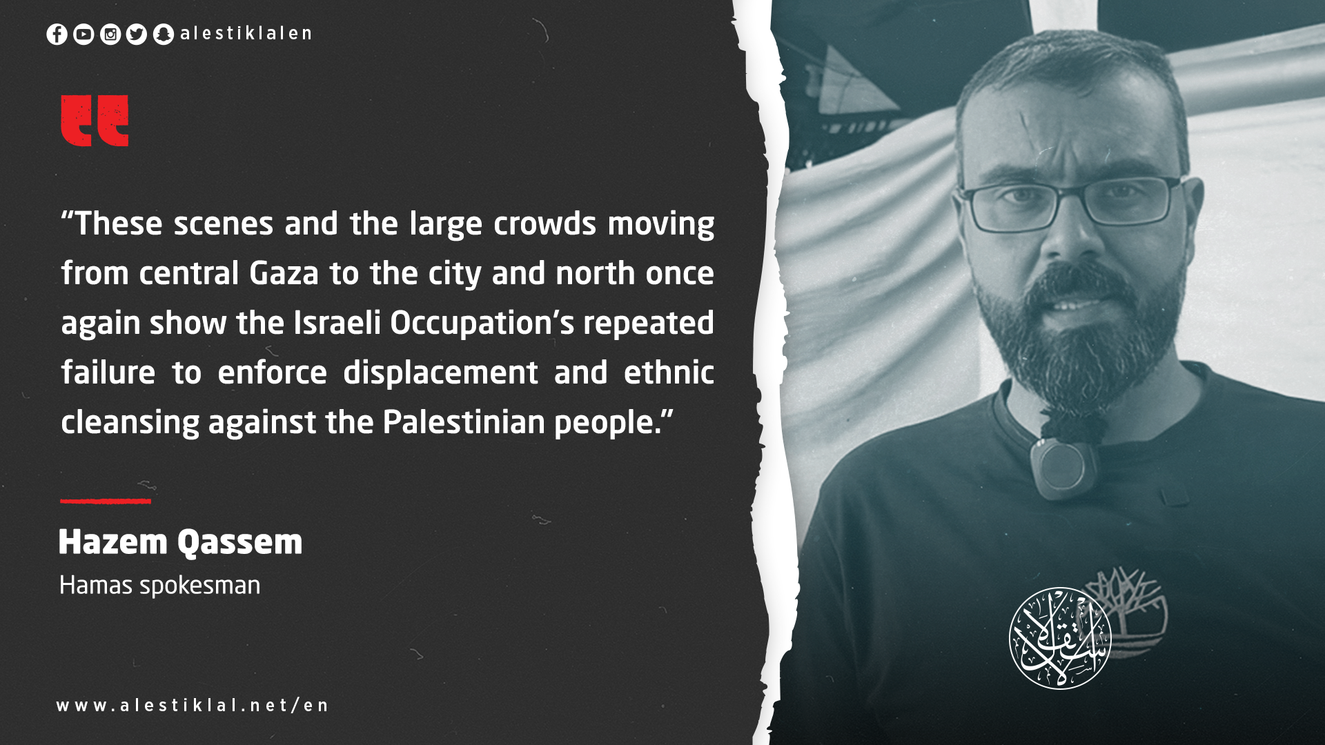 Commenting on the mass return of residents to northern Gaza following the truce, Qassem said the human tide of returnees proves “Israel’s” failure to enforce displacement or ethnic cleansing.