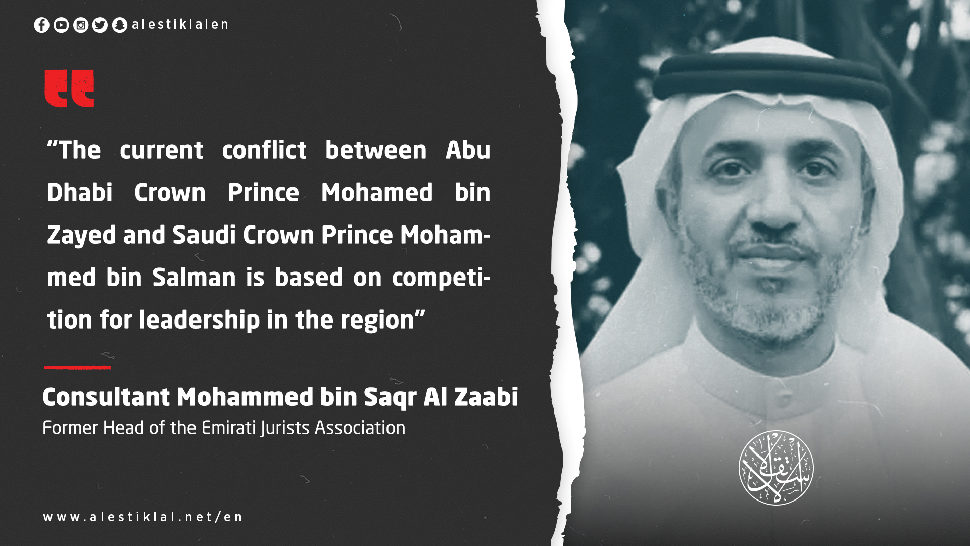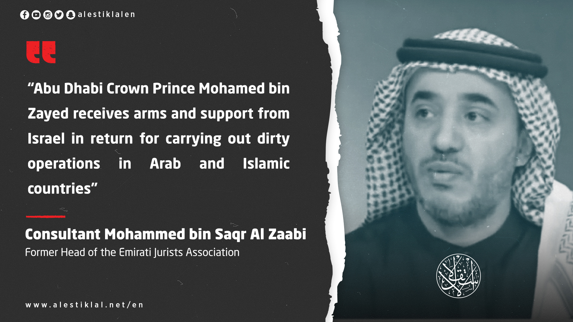 In an interview with Al-Estiklal, Al-Zaabi explained that Bin Zayed receives arms and Israeli support "in return for carrying out dirty operations in the Arab region, and that normalization with the entity is a security directive and not a popular will and desire."