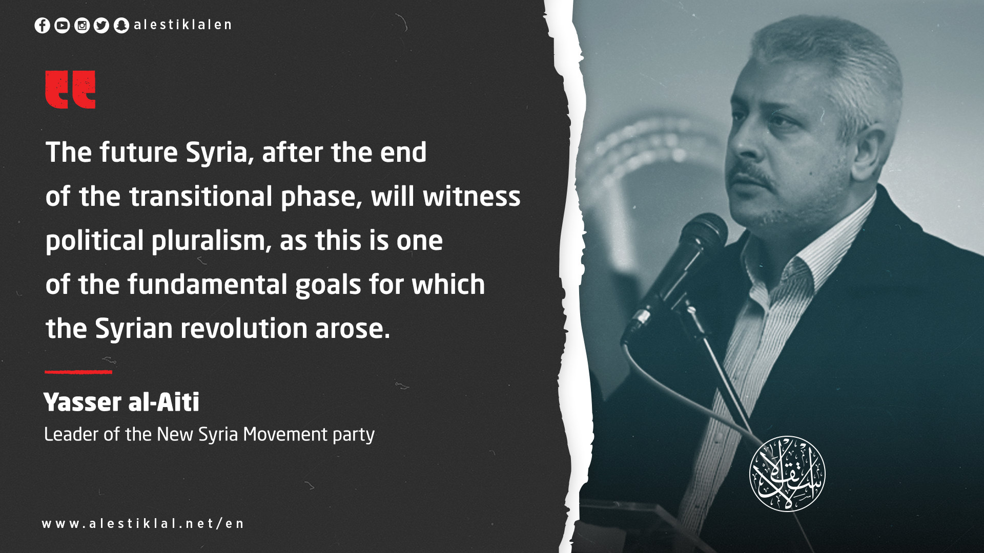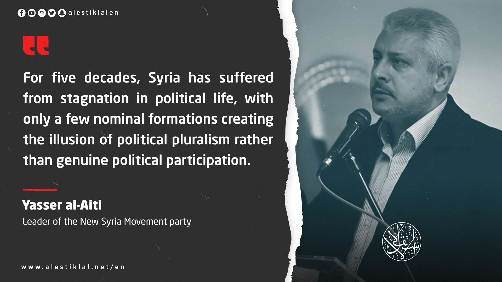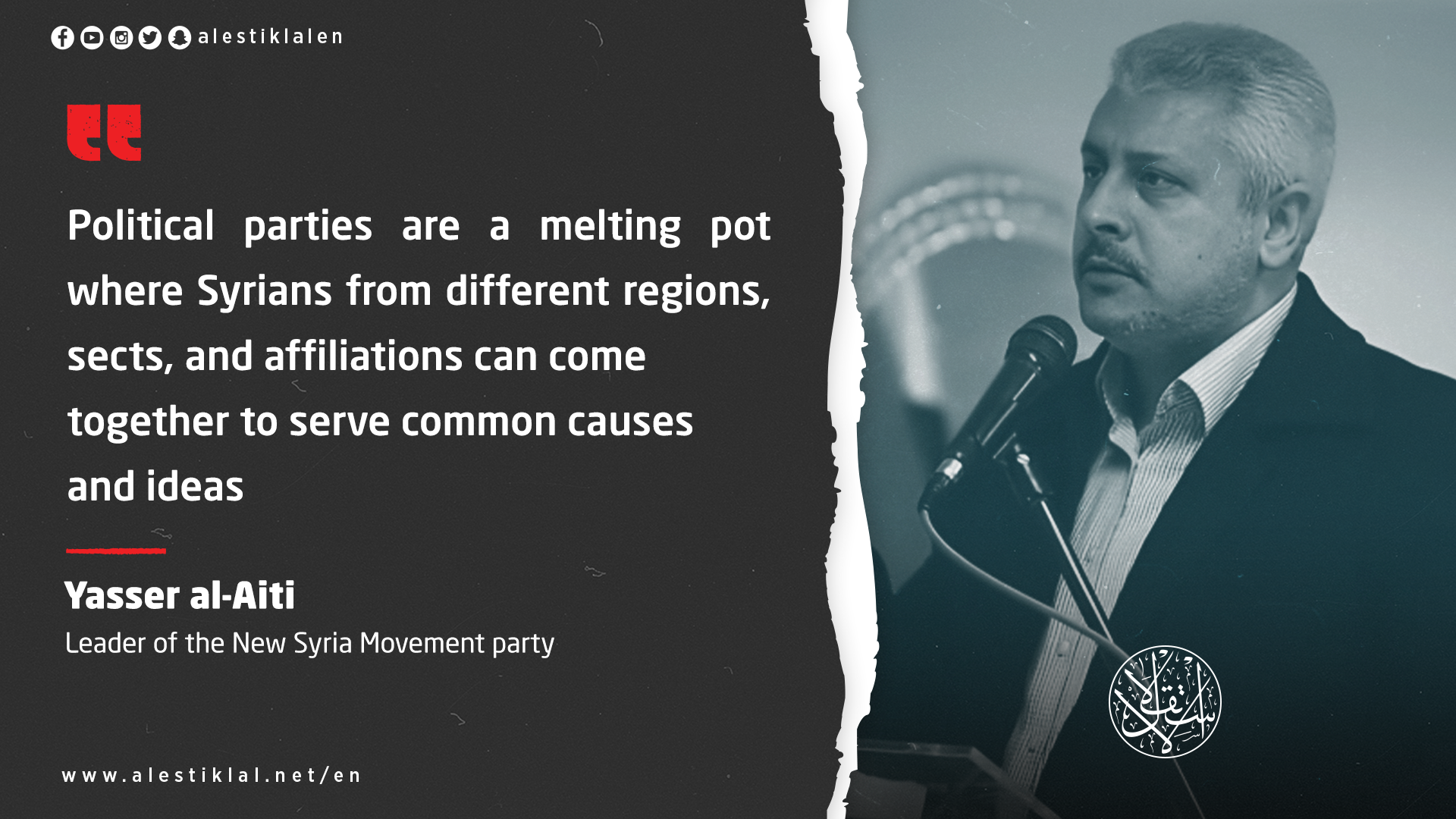 Yasser al-Aiti, the leader of the New Syria Movement party, stressed the necessity of the emergence of political parties during the transitional phase to prevent the fragmentation of society or the gathering of citizens around sub-national banners.